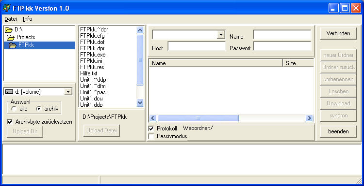 Die Bedienung des Programms ist weitestgehend selbsterklärend. Im linken Teil werden die lokalen Dateien verwaltet. Über die "Auswahl" wird festgelegt ob alle oder nur geänderte Dateien angezeigt werden. Mit "Upload Dateien" werden die Ausgewählten Dateien auf den Server übertragen und mit "Upload Dir" alle Dateien und Unterverzeichnisse auf den Server übertragen. Im oberen Teil der rechten Seite werden der Verbindungsname, Hostname, Benutzername und das Paßwort eingegeben. Die Verbindungsdaten werden automatisch gespeichert und können über das Dateimenü bearbeitet werden. Die Tasten auf der rechten Seite beziehen sich auf den FTP-Server. Auf dem FTP-Server kann immer nur eine Datei/Verzeichnis mit den Tasten verarbeitet werden. Um alle Dateien oder Verzeichnisse zu kopieren oder zu löschen öffnet man im Auswahlfenster mit der rechten Maustaste ein Kontextmenü. Programmdatei "FTPkk.exe" und "Hilfe.txt" müssen im selben Verzeichnis abgelegt werden. Die Datei "FTPkk.ini" wird automatisch angelegt und enthält bestimmte Voreinstellungen, unter anderem auch die Zugangsdaten zum FTP-Server in unverschlüsselter Form. Um die Datei "Hilfe.txt" zu downloaden klicken Sie am besten mit der rechten Maustaste auf den Menüpunkt und wählen Ziel speichern unter. |
